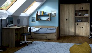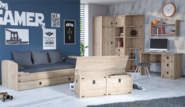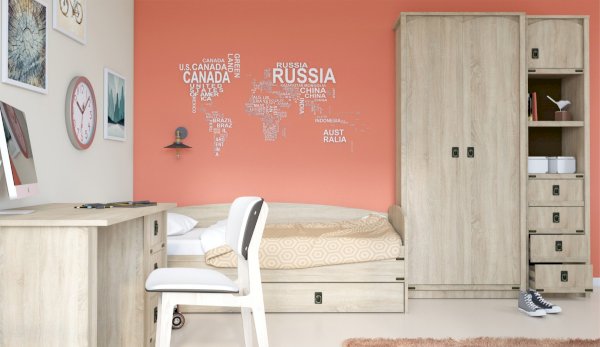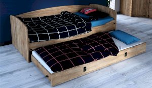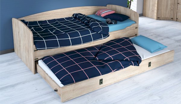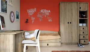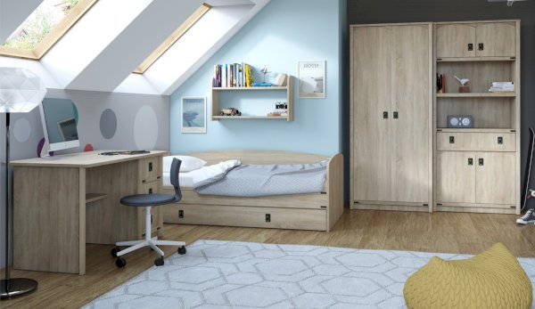 Кровать-тахта – со скругленным изголовьем и высокой спинкой имеет дополнительное спальное место, с помощью множества роликов его легко выдвинуть, можно использовать как ящик для белья. Мягкая кромка 2мм защищает края кровати от повреждений и сколов. Украшением служат стилизованные металлические ручки MARINE бронзового цвета и декоративные элементы в тон. В комплекте с декоративным матрасом и подушками превращается в молодежный диван. Пользоваться кроватью может взрослый и ребенок любого возраста, так как она имеет размеры стандартной кровати 90х200см, устойчивую конструкцию и нейтральный для интерьера цвет. Идеально компонуется со всеми модулями системы Валенсия.
