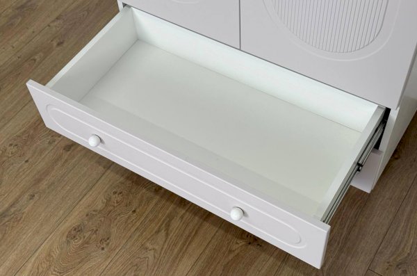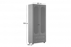 Корпус шкафа выполнен из ЛДСП толщиной 16 мм, фасады изготовлены из МДФ в плёнке ПВХ и декорированы фрезеровкой, подчёркивающей стиль серии Милана. Оригинальные круглые ручки и опоры придают шкафу аккуратный и современный вид, делая его гармоничной частью детского интерьера.